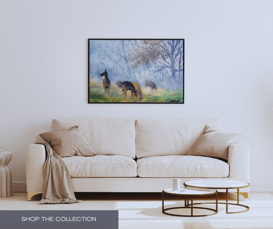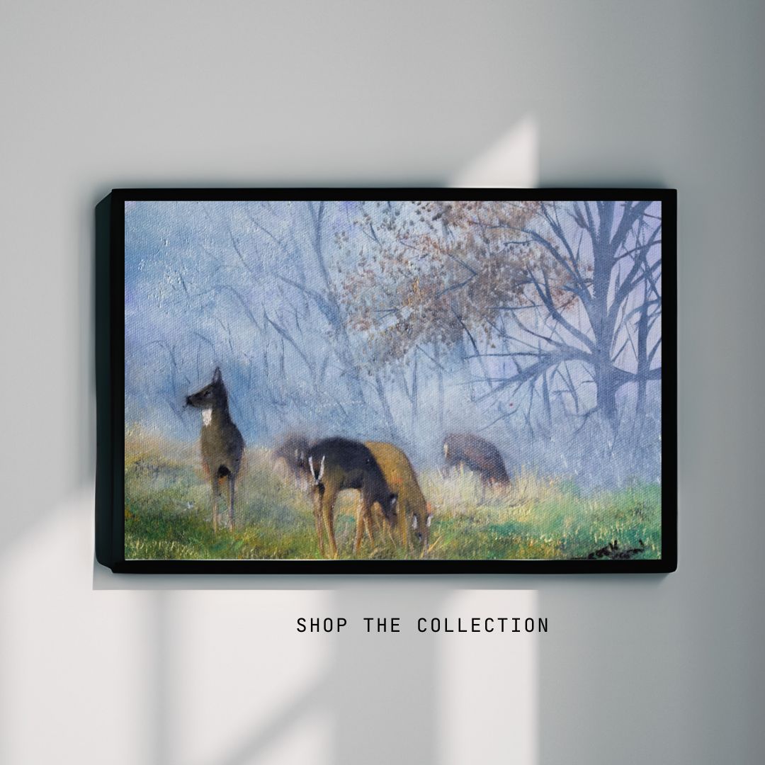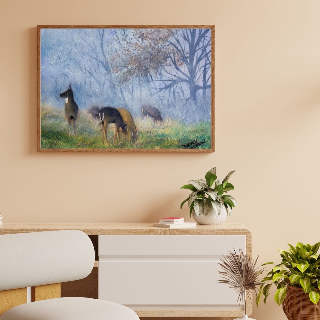 This canvas print captures an original acrylic painting depicting a serene deer emerging through the morning mist. The artwork’s subtle interplay of light and shadow evokes a tranquil, natural atmosphere, making it an elegant addition to any space seeking a touch of wilderness and calm. Crafted with attention to detail, this print preserves the texture and depth of the original piece, offering a refined visual experience for art enthusiasts.