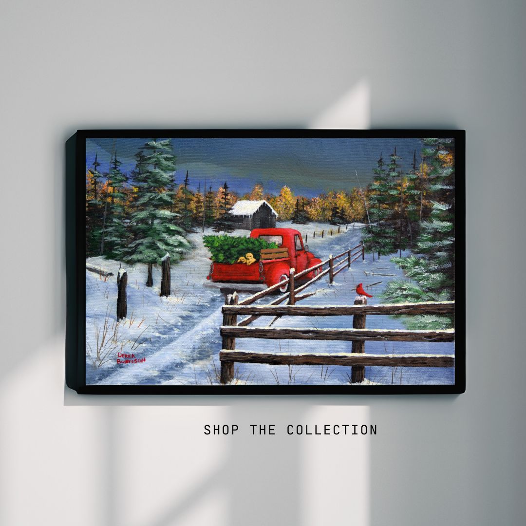 This canvas print reproduces an original acrylic painting, capturing a charming scene of a red truck carrying puppies as they bring home a holiday tree. Ideal for adding a warm, festive touch to your space, this artwork combines vibrant colors and expert brushwork to evoke the spirit of the season.