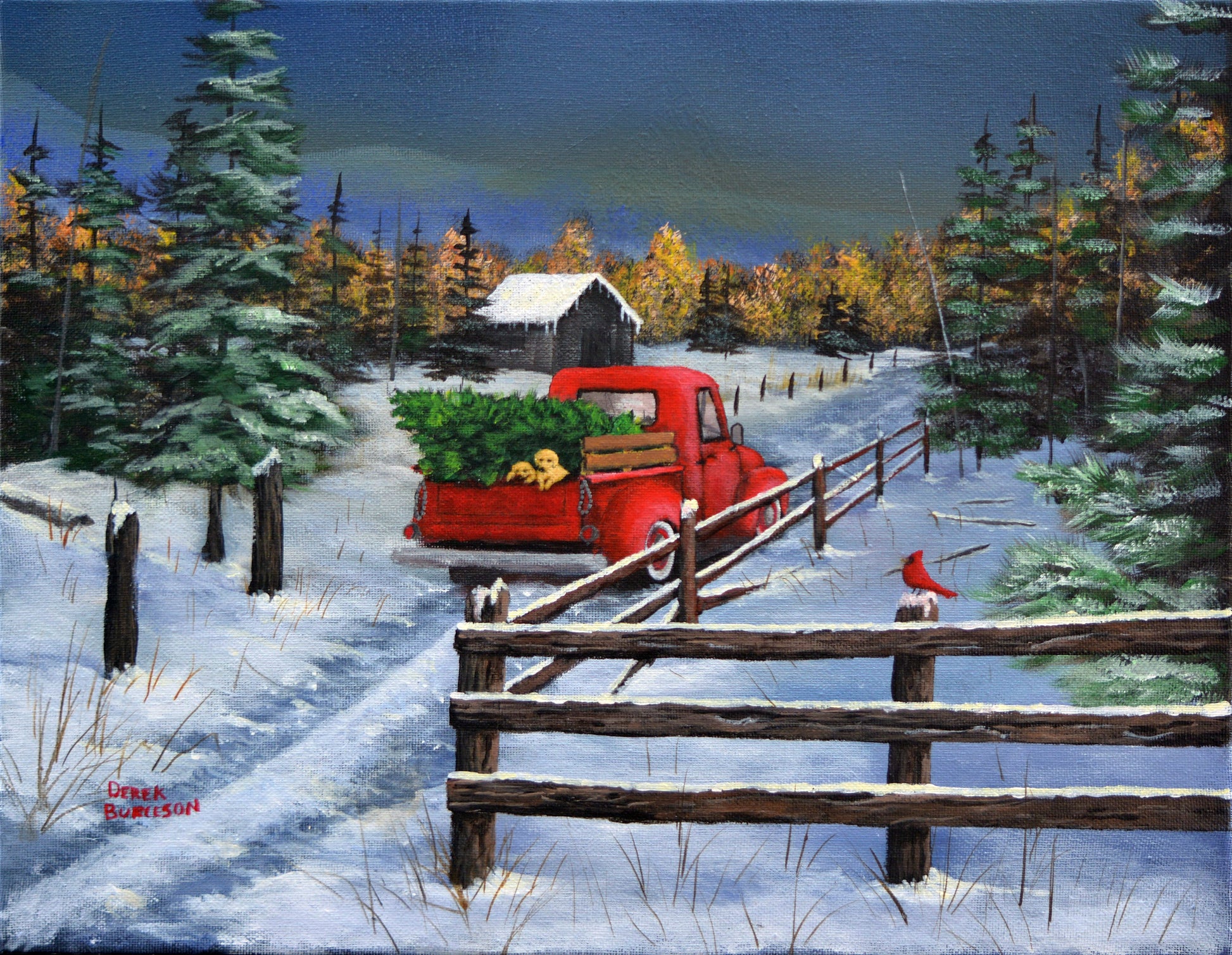 This print reproduces an original acrylic painting, capturing a charming scene of a red truck carrying puppies as they bring home a holiday tree. Ideal for adding a warm, festive touch to your space, this artwork combines vibrant colors and expert brushwork to evoke the spirit of the season.