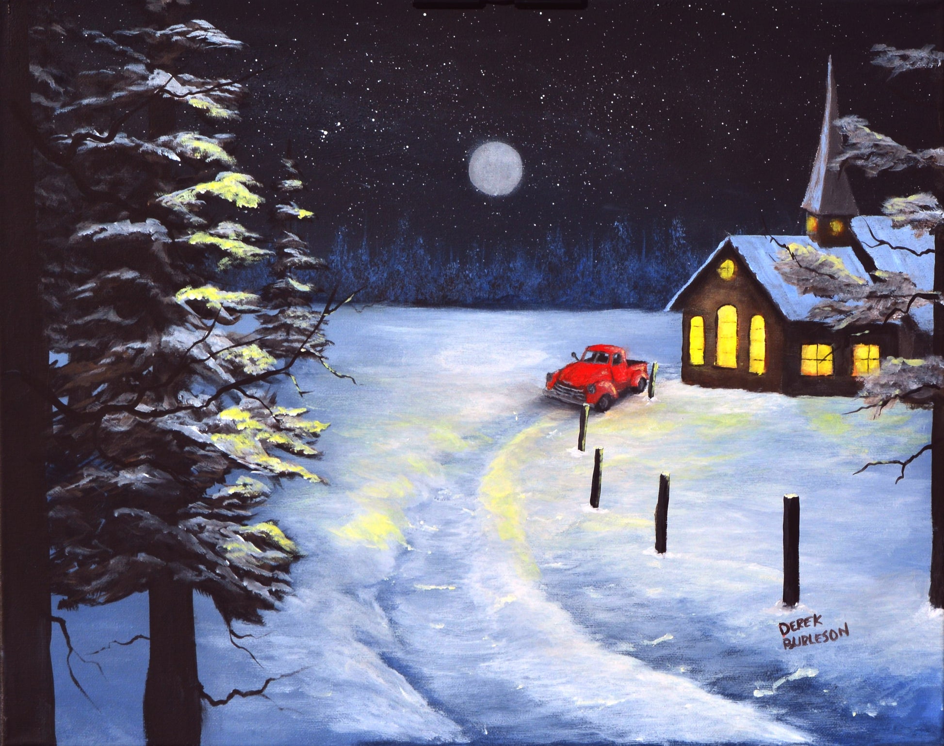 Inspired by Thomas Kinkade's renowned "Light Series," this print captures the serene warmth of a winter church service illuminated against a snowy backdrop. Featuring a charming red truck parked outside, the original acrylic painting evokes a peaceful, reflective atmosphere. Perfect for collectors and art enthusiasts, this print brings a timeless sense of comfort and community into your space.