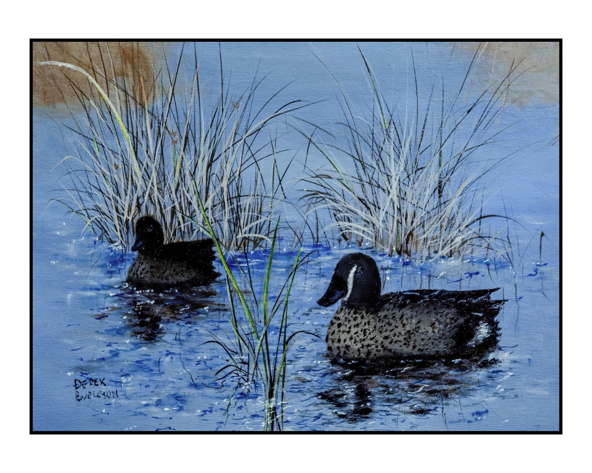 This print showcases an original acrylic painting of blue winged teal ducks, enhanced with oil finishes to bring depth and vibrancy. Perfect for art enthusiasts and nature lovers, it captures the delicate beauty and dynamic movement of these waterfowl with expert brushwork and rich textures. Ideal for adding a refined, naturalistic touch to any space.